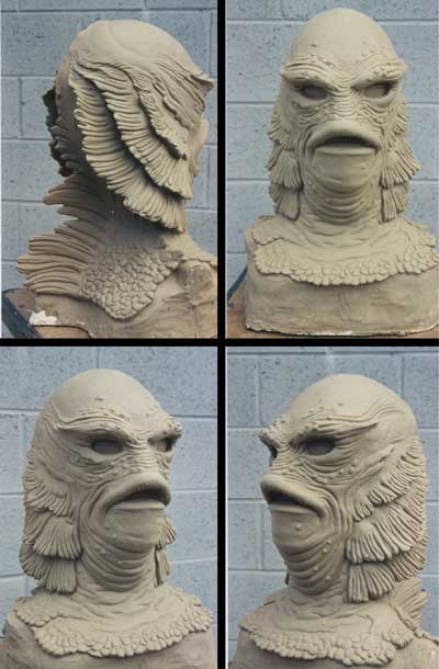 The Creature was the only Calendar Mask that had damage and missing parts from the beginning. The original fin was non existent and needed to be re-created from scratch. It was also necessary to basically re-invent his entire gill structure from the photos and original masks, which in some cases were literally crumbling and falling apart! The Creature never had a full undamaged fin from the very first day of production in the 60's (so they tell me) or the extent of gill detail that Chris Mueller originally sculpted in. According to Don Post lore, the original Creature masks were a royal pain to de-mold and sections of the fin would get hung-up and continually pull out little chunks of plaster. This would cause the molds to break down at an accelerated rate and presto... no dorsal action! Guess what? I was there when they pulled out the first Creature re-issue and even with the slightly added drafting I threw in for good measure, it still put up a fight! After all these years lying dormant waiting in the shadows, watching... REVENGE OF THE CREATURES MOLD!!