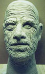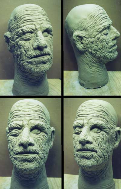 The enlarged clay versions had a basic form and shape but were void of any detail. It was like looking at a smooth, flat, mono-tone Halloween Mask that lacked any kind of finishing work. It all had to be added back in. Every wrinkle, pock-mark, pore and fold had to be in the exact same location and depth as was once in the original sculpture. The challenging part was matching each tiny portion to its corresponding area. Don and I would meet with Evil Wilhelm and Dante' Renta at different times during each masks sculptural phase. "Evil" was the main collector who initiated the entire project and oversaw every step of it. He supplied most of the original reference masks and photos. He was crucial during the re-tooling. Dante's involvement included the prototype hair work used for reference during mass production plus original masks, photos and unique insite.
