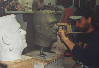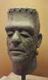 All of the re-sculpts needed a fair amount of work. I was amazed at how much detail had actually been lost. Among the most intense were the Creature "A", Glenn Strange Frankenstein, Wolf Man "A" and the Mummy version "B". At times the Mummy was a serious test in patience and on more than one occasion his curse was felt! The reference masks and material were extremely important and aided tremendously when doing the Mummy. We had excellent reference for all the masks. Without it, it would have been almost impossible to get the level of accuracy we were going for. Once molded, a sculpture is "softened" slightly and a generation is lost when the mask is pulled. The detail needed to be over-sculpted back in so the production re-issues would have the same depth and consistentcy as in the originals.